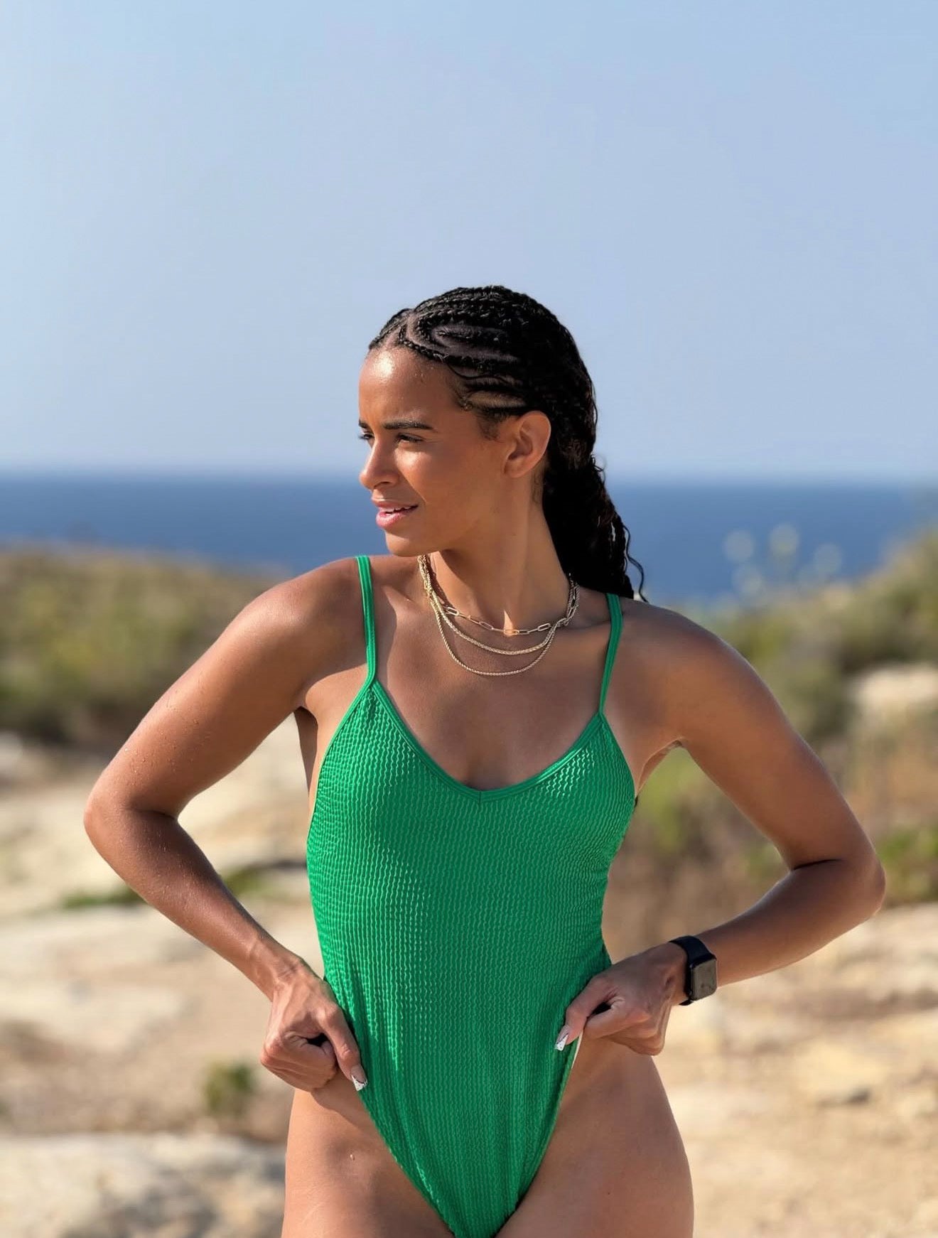 Ariel is a one-piece swimsuit with a cheeky bottom and a ribbed green fabric. Ariel also features a stretchy fabric crafted to fit any body type. This swimsuit comes with removable padding. Fits true to size.